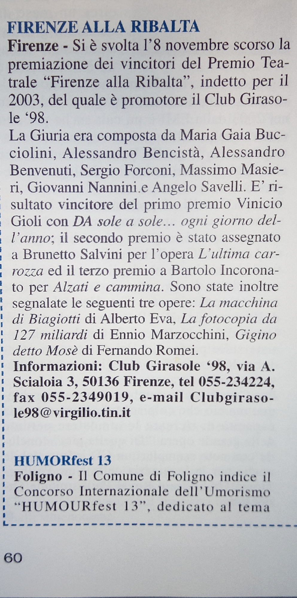Si è svolta l’8 Novembre scorso la premiazione dei vincitori del Premio Teatrale “Firenze alla Ribalta”, indetto per il 2003, del quale è promotore il Club Girasole ’98. La giuria era composta da Maria Gaia Bucciolini, Alessandro Bencistà, Alessandro Benvenuti, Sergio Forconi, Massimo Masieri, Giovanni Nannini e Angelo Savelli. E’ risultato vincitore del primo premio Vinicio Gioli con DA sole a sole… ogni giorno dell’anno; il secondo premio è stato assegnato a Brunetto Salvini per l’opera L’ultima carrozza ed il terzo premio a Bartolo Incoronato per Alzati e cammina. Sono state inoltre segnalate le seguenti tre opere: La macchina di Biagiotti di Alberto Eva, La fotocopia da 127 miliardi di Ennio Marzocchini, Gigino detto Mosè di Fernando Romei.