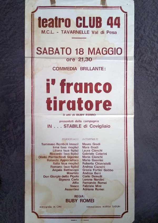 Giovanni Noferini detto “Maso” e Ettore Frigi detto “Ago-nia” due grandi protagonisti. Quanti avevano avuto modo di assistere alla rappresentazione de “I’ franco tiratore” al teatro fiorentino Il Faro, si erano espressi con parole di elogio per gli attori e soprattutto nei confronti di Bubi Ferro alias Fernando Romei l’autore della commedia che egli stesso ha portato sulla scena. Dopo l’esordio fiorentino, la commedia in tre atti è stata riproposta con nuovi attori al cinema teatro Taiuti di S. Piero a Sieve. Sulla scena tutti ragazzi di S. Piero che oltre al calore per alcune battute hanno dato calore alle vicende rappresentate che ci richiamano a situazioni vissute negli anni ’40 in una realtà fiorentina nella quale faceva spicco l’egoismo e la generosità, il precario equilibrio e la mal celata sicurezza di alcuni personaggi. Parlare della commedia non è certamente agevole visto il groviglio di situazioni in cui i personaggi cercano di districarsi. La rappresentazione va vista e seguita perché possano essere apprezzate le realtà e le sottigliezze di un’epoca in cui non sempre era concesso di parlare a “cuor sincero”. Se l’autore ha avuto l’accortezza, la delicatezza, la semplicità e l’attenzione di essere sempre esauriente, gli attori, da parte loro, hanno espresso quella personalità spiccata e coerente che ha favorito la chiarezza delle vicende raccontate. Se il testo ha sollecitato il richiamo ad una realtà “di anni ruggenti” i personaggi hanno reso ancora più veritiera la psicologica, a volte drammatica, sudditanza politica di alcuni. Nello “spaccato” comico-satirico tutti i personaggi-attori hanno recitato con grande professionalità e sicurezza. La vera sorpresa è stata quella di Tommaso Romboli detto “Muso” ed interpretato da Giovanni Noferini autentica rivelazione, ben affiancato dalla moglie Irma al secolo Gabriella Romei e la fugace apparizione dei figli Riccardo (Francesco Conti) e Liliana (Silvia Padellini). Particolarmente apprezzato ed applaudito Olinto Piantachiodi detto “Agonia” impersonato dal sempre brillante ed imprevedibile Ettore Frilli. Non vogliamo assolutamente creare classifiche di merito perché tutti hanno contribuito in maniera determinante al grande successo della rappresentazione ma oltre ad Alfio (Neri Paricheui) a Maurizio (Maurizio Nardini), Vasco (Daniele Bastianacci) una nota di particolare rilievo per le caratteristiche dei personaggi devono essere riservate a Rolando Appicciafoco “Il Federale” alias Roberto Barchelli e sua moglie Italia (Italia Lisi) il figlio adottivo Romano (da bambino Lorenzo Arnetoli, da grande Alessandro Suggelli) a Angela Battiscopa (Pamela Morandi). Per finire elogio alla non facile interpretazione, ma riuscitissima, di Don Giorgio detto “Pigola” il prete timoroso e deciso a seconda delle circostanze, ben portato sulla scena da Andrea Bani e l’addolorata mamma Carla (Alessandra Berni) che attende il ritorno del figlio che mai rivedrà. Tanti personaggi, tanto successo hanno costretto alla programmazione straordinaria di una replica la cui data sarà resa nota nei prossimi giorni. (Paolo Berti)