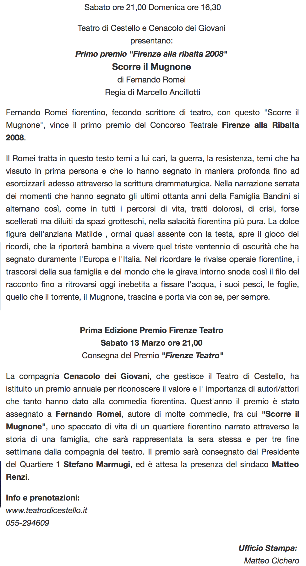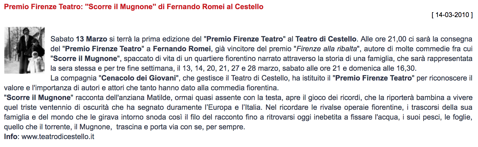 Premio Firenze Teatro: ”Scorre il Mugnone” di Fernando Romei al Cestello
